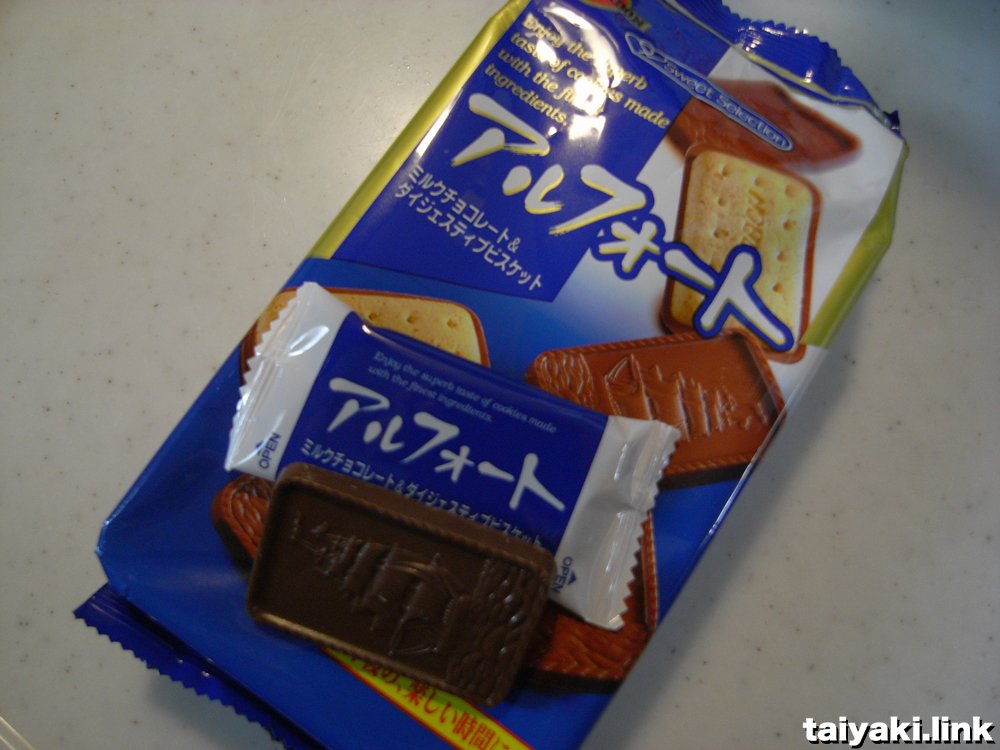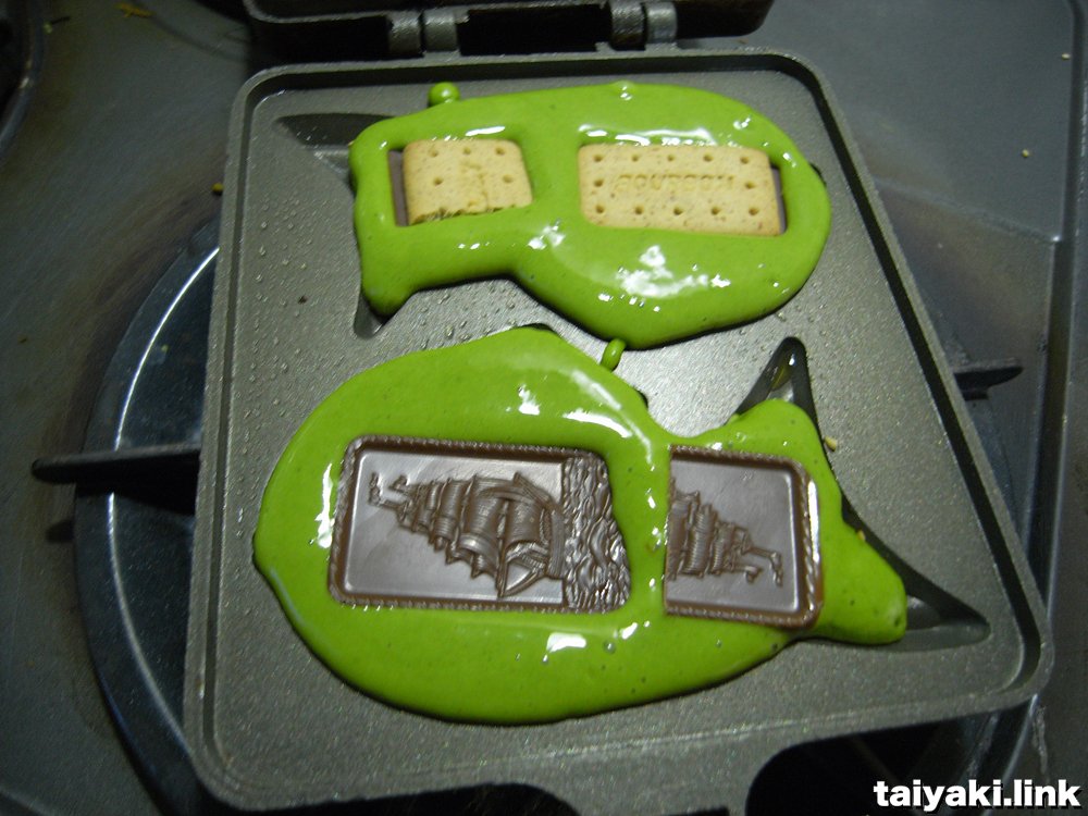 抹茶アルフォートたい焼き 2016/12/17 2017/3/22 taiyaki 抹茶の皮にブルボンの銘菓アルフォートをセット。チョコとクッキーのハーモニーがたい焼きの中で熟成される味。 チョコは溶け、クッキーは柔らかくなって香ばしさを醸し出しています。