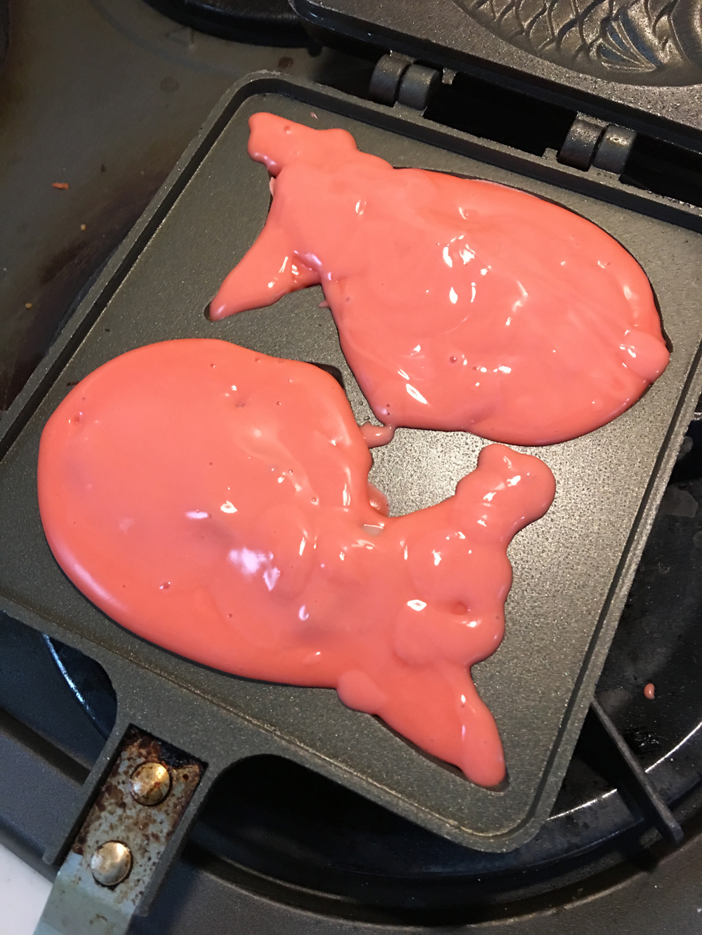 9)これで完成。たい焼きのおなかにクリームを装塡するとき、装塡したクリームが皮の材料できれいに覆われるよう、丁寧にかけます。あまり大量に具をセットすると、焼いているうちに沸騰して具が皮からあふれて大事故となりますので、具の量はほどほどに。