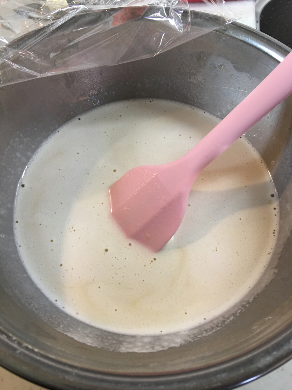 4)取り出して、かきまぜる。まださらささらの液体状態。よく混ぜる。