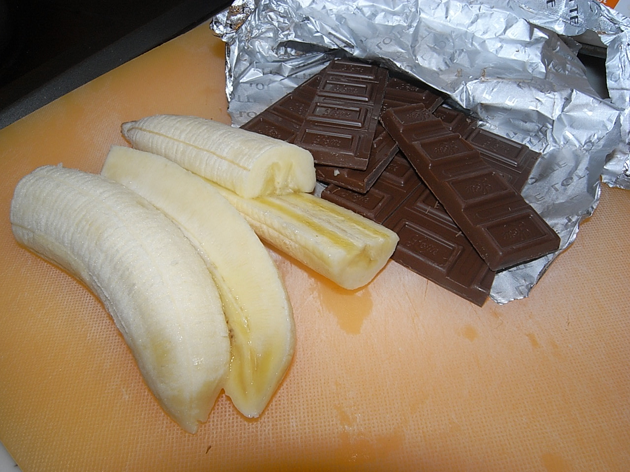 ・切ったバナナを胴体にセットし、その上または横の隙間に板チョコをちぎって乗せます。