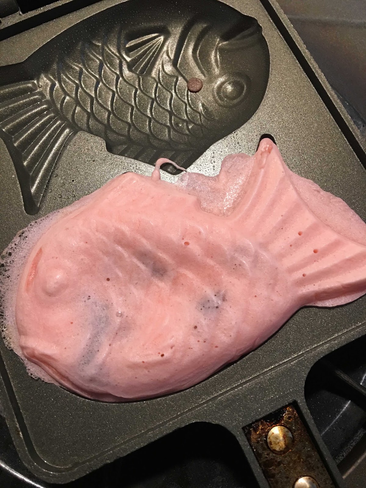 桜色たい焼きです。白いたい焼きの本を作り、そこに食紅を本のすこし入れました。中身はやはりあんこ!